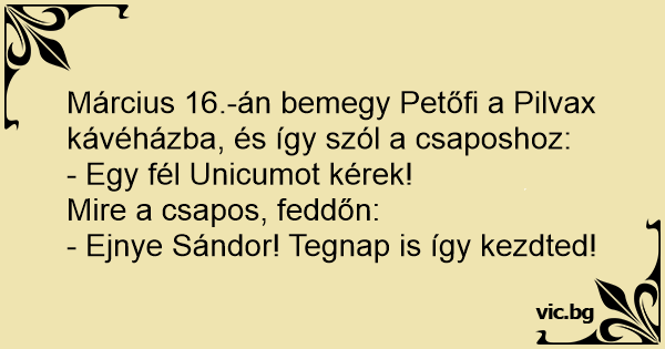 Március 16.-án bemegy Petőfi a Pilvax kávéházba, és így szól a csaposhoz: