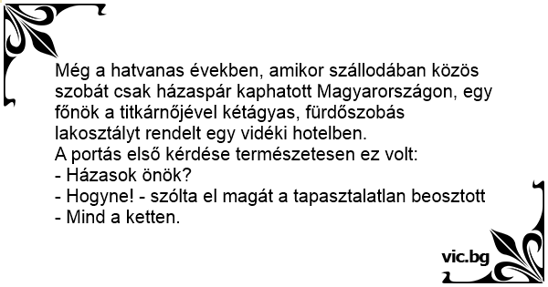 Még a hatvanas években, amikor szállodában közös szobát csak házaspár kaphatott Magyarországon, egy főnök a titkárnőjével kétágyas, fürdőszobás lakosztályt rendelt egy vidéki hotelben.