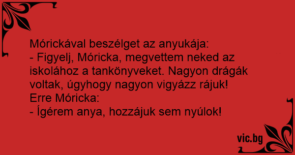 - Figyelj, Móricka, megvettem neked az iskolához a tankönyveket. Nagyon drágák voltak, úgyhogy nagyon vigyázz rájuk!