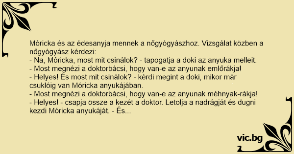 - Helyes! - csapja össze a kezét a doktor. Letolja a nadrágját és dugni kezdi Móricka anyukáját. - És most mit csinálok? - kérdi a doki vigyorogva.