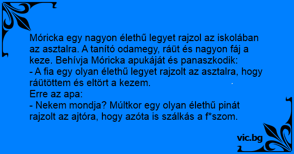 - Nekem mondja? Múltkor egy olyan élethű pinát rajzolt az ajtóra, hogy azóta is szálkás a f*szom.