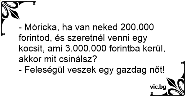 - Móricka, ha van neked 200.000 forintod, és szeretnél venni egy kocsit, ami 3.000.000 forintba kerül, akkor mit csinálsz?