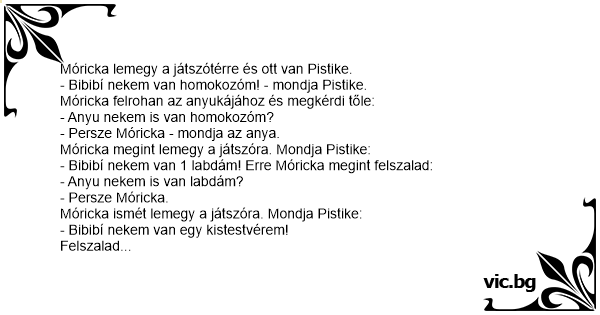 Móricka megint lemegy a játszóra. Mondja Pistike: