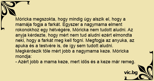 Móricka megszokta, hogy mindig úgy alszik el, hogy a mamája fogja a farkát. Egyszer a nagymama elment rokonokhoz egy hétvégére, Móricka nem tudott aludni. Az anyja kérdezte, hogy mért nem tud aludni ezért elmondta neki, hogy a farkát meg kell fogni. Megfogja az anyuka, az apuka és a testvére is, de így sem tudott aludni. Megkérdezik tőle mért jobb a nagymama keze. Móricka mondja: