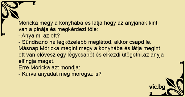 Móricka megy a konyhába és látja hogy az anyjának kint van a pinája és megkérdezi tőle: