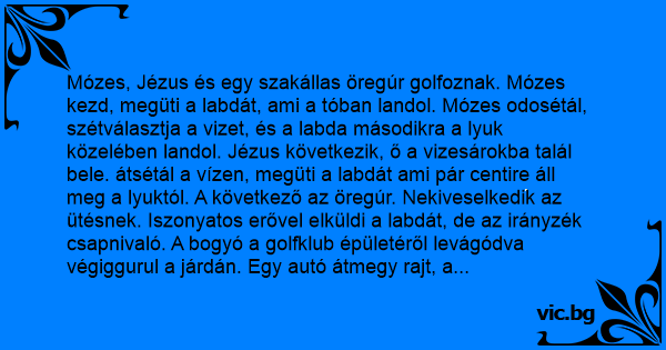 Mózes, Jézus és egy szakállas öregúr golfoznak. Mózes kezd, megüti a labdát, ami a tóban landol. Mózes odosétál, szétválasztja a vizet, és a labda másodikra a lyuk közelében landol. Jézus következik, ő a vizesárokba talál bele. átsétál a vízen, megüti a labdát ami pár centire áll meg a lyuktól. A következő az öregúr. Nekiveselkedik az ütésnek. Iszonyatos erővel elküldi a labdát, de az irányzék csapnivaló. A bogyó a golfklub épületéről levágódva végiggurul a járdán. Egy autó átmegy rajt, a kerék alól felpattanva a közeli halastóba esik. Utánaugrik egy béka és bekapja, majd kiül egy tavirózsára. Abban a pillanatban a magasból lecsap egy gólya, elkapja a békát, majd felszáll vele. A béka szájából kiesik a labda, végigcsorog a domboldalon és a lyukba pottyan. Egy ütésből telitalálat. Mózes erre odafordul Jézushoz: