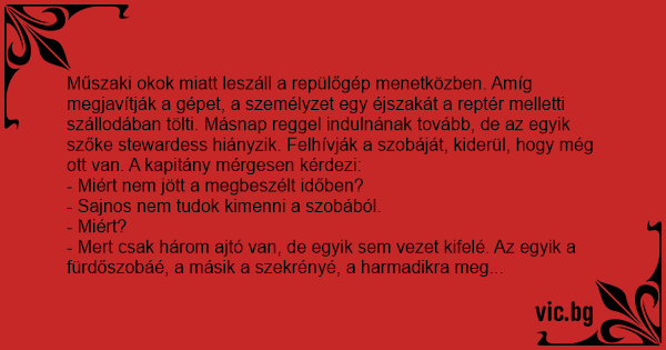 - Mert csak három ajtó van, de egyik sem vezet kifelé. Az egyik a fürdőszobáé, a másik a szekrényé, a harmadikra meg az van írva: