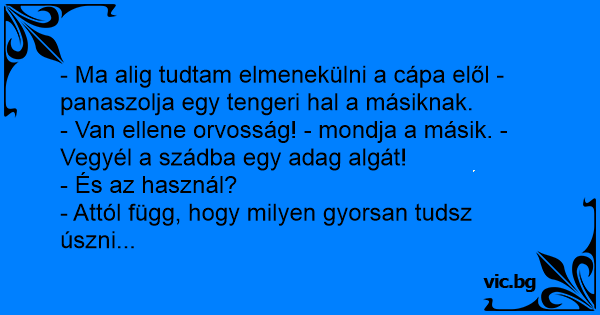 - Ma alig tudtam elmenekülni a cápa elől - panaszolja egy tengeri hal a másiknak.