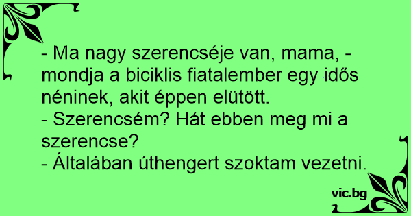 - Ma nagy szerencséje van, mama, - mondja a biciklis fiatalember egy idős néninek, akit éppen elütött.