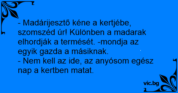 - Madárijesztő kéne a kertjébe, szomszéd úr! Különben a madarak elhordják a termését. -mondja az egyik gazda a másiknak.