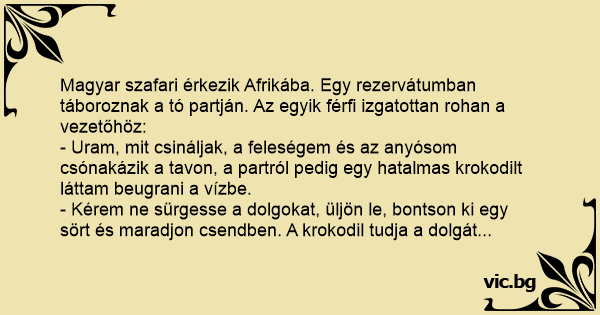 - Uram, mit csináljak, a feleségem és az anyósom csónakázik a tavon, a partról pedig egy hatalmas krokodilt láttam beugrani a vízbe.