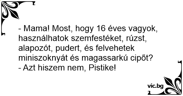 - Mama! Most, hogy 16 éves vagyok, használhatok szemfestéket, rúzst, alapozót, pudert, és felvehetek miniszoknyát és magassarkú cipőt?