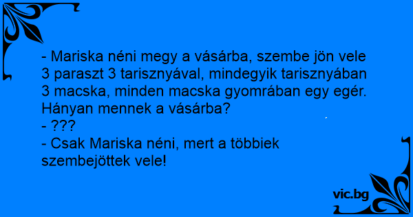- Mariska néni megy a vásárba, szembe jön vele 3 paraszt 3 tarisznyával, mindegyik tarisznyában 3 macska, minden macska gyomrában egy egér. Hányan mennek a vásárba?