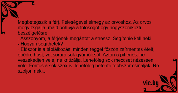 - Asszonyom, a férjének megártott a stressz. Segítenie kell neki.