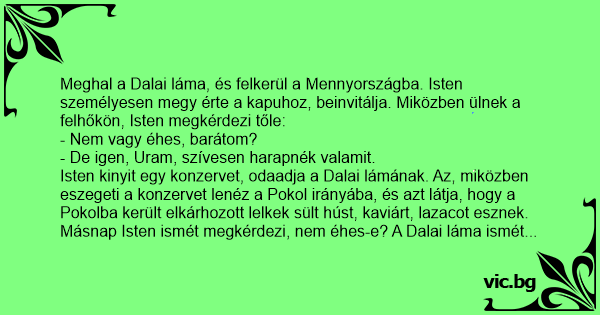 Isten kinyit egy konzervet, odaadja a Dalai lámának. Az, miközben eszegeti a konzervet lenéz a Pokol irányába, és azt látja, hogy a Pokolba került elkárhozott lelkek sült húst, kaviárt, lazacot esznek.
