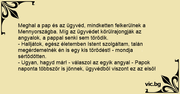 - Ugyan, hagyd már! - válaszol az egyik angyal - Papok naponta többször is jönnek, ügyvédből viszont ez az első!