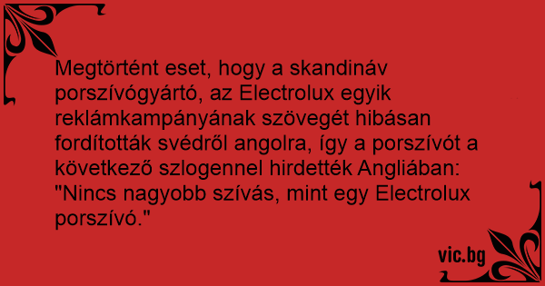 Megtörtént eset, hogy a skandináv porszívógyártó, az Electrolux egyik reklámkampányának szövegét hibásan fordították svédről angolra, így a porszívót a következő szlogennel hirdették Angliában: