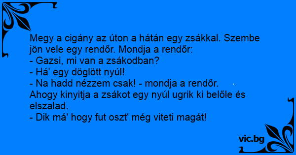 Megy a cigány az úton a hátán egy zsákkal. Szembe jön vele egy rendőr. Mondja a rendőr: