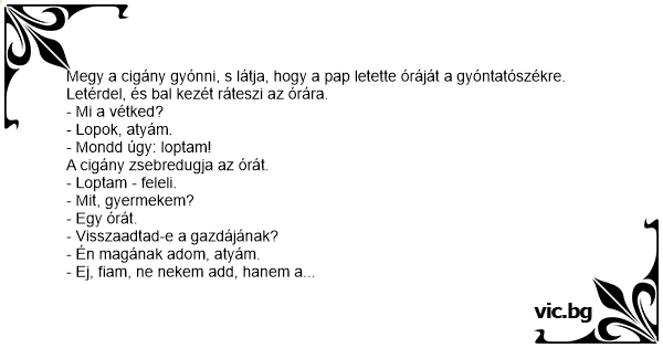 Megy a cigány gyónni, s látja, hogy a pap letette óráját a gyóntatószékre. Letérdel, és bal kezét ráteszi az órára.