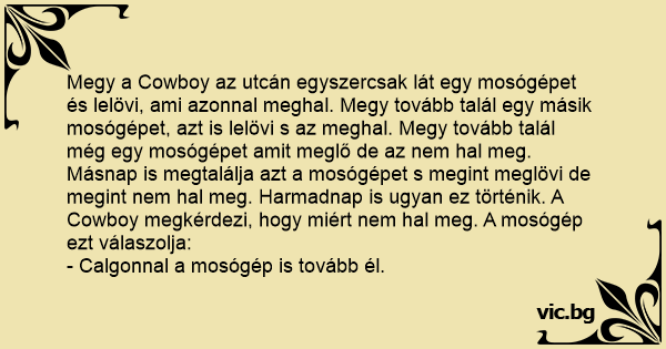 Megy a Cowboy az utcán egyszercsak lát egy mosógépet és lelövi, ami azonnal meghal. Megy tovább talál egy másik mosógépet, azt is lelövi s az meghal. Megy tovább talál még egy mosógépet amit meglő de az nem hal meg. Másnap is megtalálja azt a mosógépet s megint meglövi de megint nem hal meg. Harmadnap is ugyan ez történik. A Cowboy megkérdezi, hogy miért nem hal meg. A mosógép ezt válaszolja: