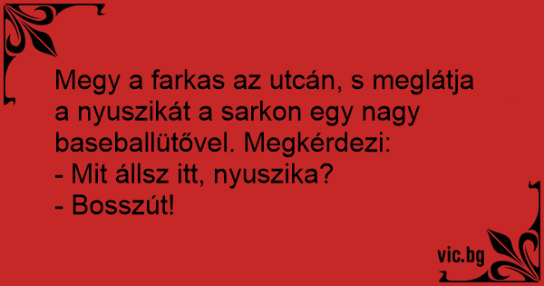 Megy a farkas az utcán, s meglátja a nyuszikát a sarkon egy nagy baseballütővel. Megkérdezi: