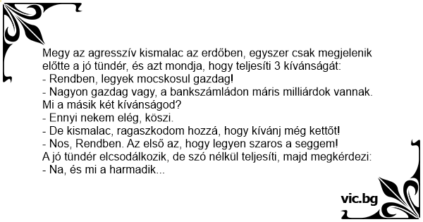 Megy az agresszív kismalac az erdőben, egyszer csak megjelenik előtte a jó tündér, és azt mondja, hogy teljesíti 3 kívánságát: