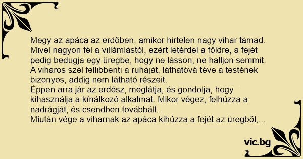 Megy az apáca az erdőben, amikor hirtelen nagy vihar támad. Mivel nagyon fél a villámlástól, ezért letérdel a földre, a fejét pedig bedugja egy üregbe, hogy ne lásson, ne halljon semmit.