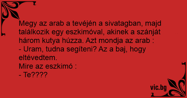 Megy az arab a tevéjén a sivatagban, majd találkozik egy eszkimóval, akinek a szánját három kutya húzza. Azt mondja az arab :