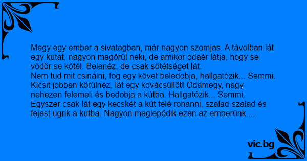 Megy egy ember a sivatagban, már nagyon szomjas. A távolban lát egy kutat, nagyon megörül neki, de amikor odaér látja, hogy se vödör se kötél. Belenéz, de csak sötétséget lát.
