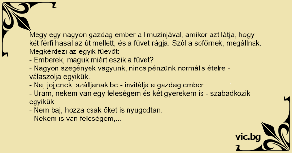 Megy egy nagyon gazdag ember a limuzinjával, amikor azt látja, hogy két férfi hasal az út mellett, és a füvet rágja. Szól a sofőrnek, megállnak. Megkérdezi az egyik fűevőt: