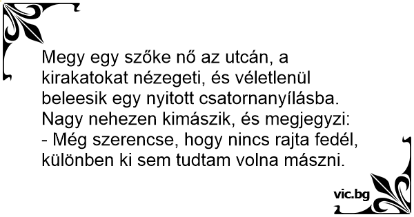 Megy egy szőke nő az utcán, a kirakatokat nézegeti, és véletlenül beleesik egy nyitott csatornanyílásba.