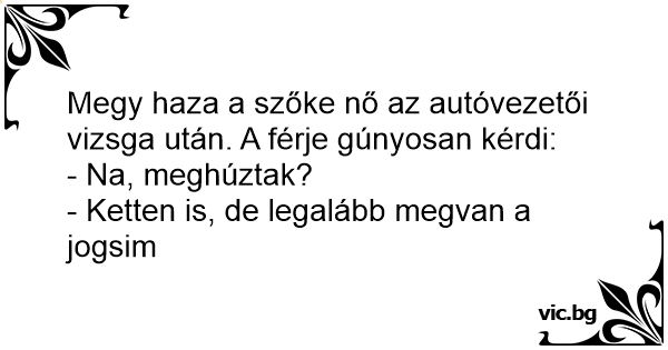 Megy haza a szőke nő az autóvezetői vizsga után. A férje gúnyosan kérdi: