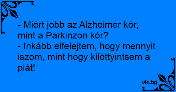 Alzheimer oder Parkison Двама пияници си говорят. Un mec demande a son pote: - Коя болест е по-добра - Алцхаймер или Паркинсон? Новинар прашува Кавадарчанец: 2 potes discutent : Deux hommes discutent dans un bar : Was ist schlimmer: Alzheimer oder Parkinson? - Ganz klar: Parkinson. Es ist besser ein Bier zu vergessen, als eines zu verschütten! Je préfère être atteint de la maladie de Parkinson plutôt que Alzheimer. Ben oui, je préfère renverser ma bière plutôt que d'oublier de la boire ! Was ist Besser Parkinson oder Alzheimer? Alzheimer. Besser ein Bier vergessen statt ein Bier zu verschütten. E’ meglio avere la malattia di Alzheimer o la malattia di Parkinson? L’ Alzheimer … E’ meglio dimenticare di pagare il proprio bicchiere piuttosto che versarselo addosso! Co jest gorsze: choroba Parkinsona czy Alzheimera? - Właściwie to wszystko jedno, czy się wyleje piwo czy zapomni gdzie postawiło? À ton avis, mieux vaut avoir la maladie d'Alzheimer ou de Parkinson? Alzheimer, car mieux vaut oublier de payer son verre que de le renverser! Καλύτερα να έχεις Parkinson παρά Alzheimer, γιατί είναι καλύτερα να χύσεις λίγο απο το ποτήρι σου παρά να ξεχάσεις να πιείς. Waarom kun je beter Alzheimer hebben dan de ziekte van Parkinson?Je kunt beter een glas bier vergeten te betalen dan om te stoten - Melyik a jobb, az Alzheimer vagy a Parkinson kór? - Az Alzheimer, mert jobb elfelejteni fizetni, mint kilötyögtetni a sört. Rozdíl mezi alzheimerem a parkinsonem: Je lepší trochu vylít, než zapomenout vypít..