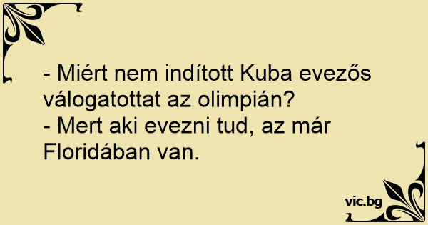 Знаете ли защо Куба нямат национален отбор по плуване !? Защо мексиканците нямат Олимпийски отбор? ¿Por qué los mexicanos no van a las Olimpiadas?. Mexico doesn't win Olympic medals because all the best runners, jumpers, and swimmers are in America. Why doesn't Mexico have any teams competing in the Olympics? ¿Por qué en Cuba no hay piscinas?.,Porque todos los que saben nadar se han ido a los EEUU... Why doesn’t Mexico have an Olympic team? All the Mexicans who can run, jump or swim are already in the USA. ¿Porque México no tiene equipo olímpico? Porque todos los mexicanos que saben correr, saltar y nadar están en Estados Unidos Waarom doet Mexico nooit mee aan de Olympische Spelen? Alles wat hard kan rennen, springen of zwemmen zit al in Amerika… Miksi Meksikolla ei ole olympiajoukkuetta? - Koska kaikki juoksu-, hyppy-, ja uintitaitoiset ovat jo karanneet Yhdysvaltojen puolelle