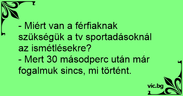 - Miért van a férfiaknak szükségük a tv sportadásoknál az ismétlésekre?<br />- Mert 30 másodperc után már fogalmuk sincs, mi történt.