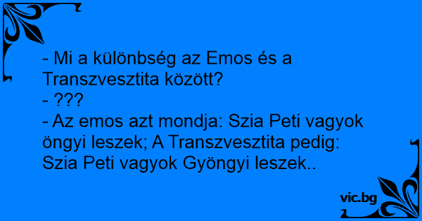 - Az emos azt mondja: Szia Peti vagyok öngyi leszek; A Transzvesztita pedig: Szia Peti vagyok Gyöngyi leszek..