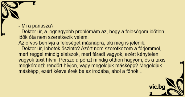 - Doktor úr, lehetek őszinte? Azért nem szeretkezem a férjemmel, mert reggel mindig elalszok, mert fáradt vagyok, ezért kénytelen vagyok taxit hívni. Persze a pénzt mindig otthon hagyom, és a taxis megkérdezi: rendőrt hívjon, vagy megoldjuk másképp? Megoldjuk másképp, ezért késve érek be az irodába, ahol a főnök megkérdezi, kirúgjon vagy megoldjuk másképp? Megoldjuk másképp, és mivel a főnök csak este ér rá, ezért kénytelen vagyok megint taxit hívni, de pénzem az még mindig nincs. Ezért megkérdezi a taxis, rendőrt hívjon, vagy megoldjuk másképp? Természetesen megoldjuk másképp. Mire aztán hazaérek, hulla fáradt vagyok, és csak aludni tudok.