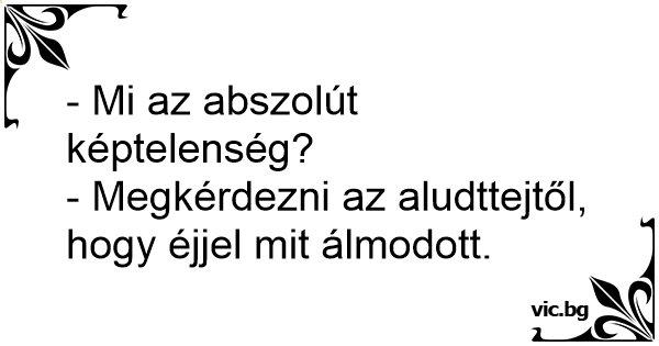 - Mi az abszolút képtelenség?- Megkérdezni az aludttejtől, hogy éjjel mit álmodott. 66 0 0 Kérdés-felelet viccek