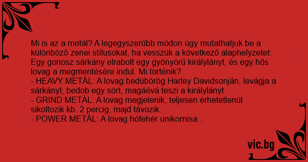 Mi is az a metál? A legegyszerűbb módon úgy mutathatjuk be a különböző zenei stílusokat, ha vesszük a következő alaphelyzetet: Egy gonosz sárkány elrabolt egy gyönyörű királylányt, és egy hős lovag a megmentésére indul. Mi történik?