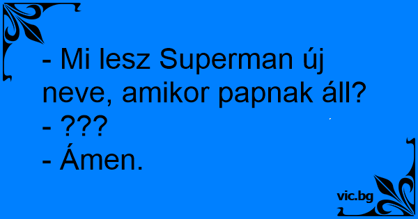 - Mi lesz Superman új neve, amikor papnak áll?- ???- Ámen. 69 0 0 Superman poénok Viccek Szuperhősökről