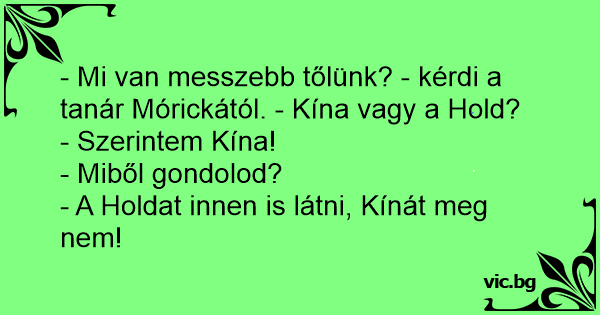 - Mi van messzebb tőlünk? - kérdi a tanár Mórickától. - Kína vagy a Hold?