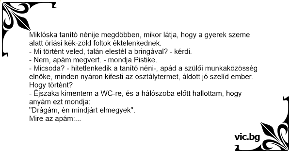- Micsoda? - hitetlenkedik a tanító néni-, apád a szülői munkaközösség elnöke, minden nyáron kifesti az osztálytermet, áldott jó szelíd ember. Hogy történt?