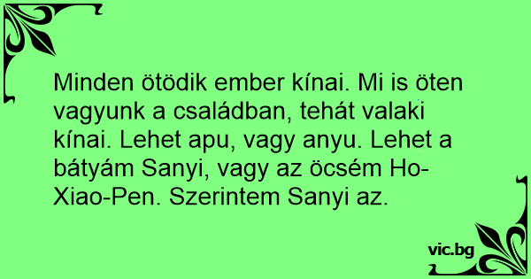 Minden ötödik ember kínai. Mi is öten vagyunk a családban, tehát valaki kínai. Lehet apu, vagy anyu. Lehet a bátyám Sanyi, vagy az öcsém Но-Xiao-Pen. Szerintem Sanyi az.