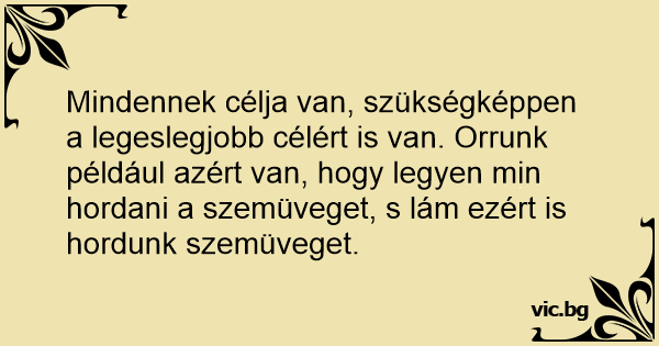 Mindennek célja van, szükségképpen a legeslegjobb célért is van. Orrunk például azért van, hogy legyen min hordani a szemüveget, s lám ezért is hordunk szemüveget.