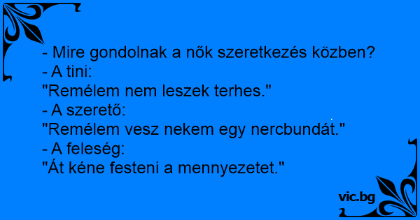 Šta misle devojka, prostitutka i udata žena dok vode ljubav? Devojka misli: važno je da ne ostanem trudna. Prostitutka misli: nadam se da ovaj dobro plaća. Žena misli: ovaj plafon stvarno mora da...