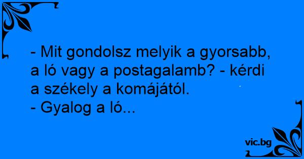 - Mit gondolsz melyik a gyorsabb, a ló vagy a postagalamb? - kérdi a székely a komájától.