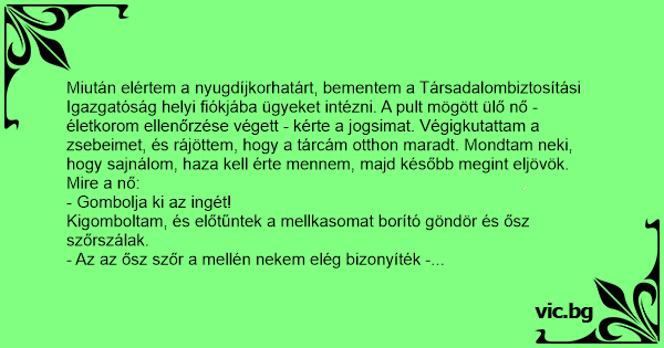 Miután elértem a nyugdíjkorhatárt, bementem a Társadalombiztosítási Igazgatóság helyi fiókjába ügyeket intézni. A pult mögött ülő nő - életkorom ellenőrzése végett - kérte a jogsimat. Végigkutattam a zsebeimet, és rájöttem, hogy a tárcám otthon maradt. Mondtam neki, hogy sajnálom, haza kell érte mennem, majd később megint eljövök.