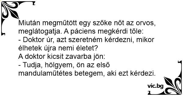 - Tudja, hölgyem, ön az első mandulaműtétes betegem, aki ezt kérdezi.