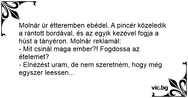 Molnár úr étteremben ebédel. A pincér közeledik a rántott bordával, és az egyik kezével fogja a húst a tányéron. Molnár reklamál: