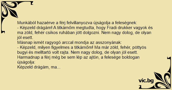 Harmadnap a férj még be sem lép az ajtón, a felesége boldogan újságolja: